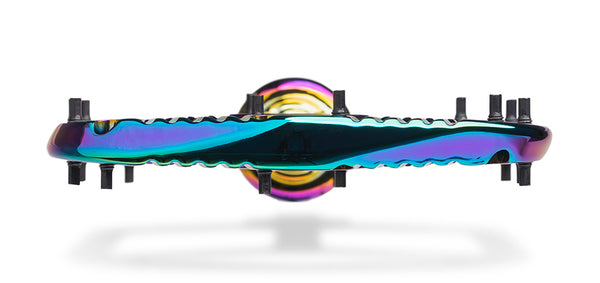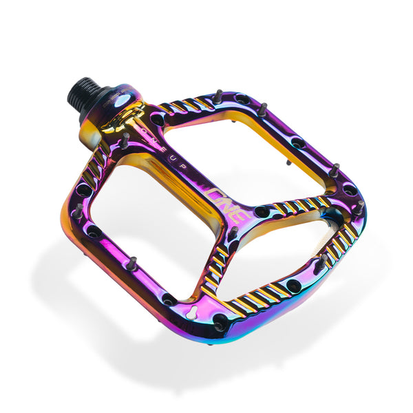 Clip less rocks with our ultra thin and super grippy Aluminum Pedals. The large platform, replaceable pins and slightly convex shape make a natural and secure fit under the arch of your foot.
